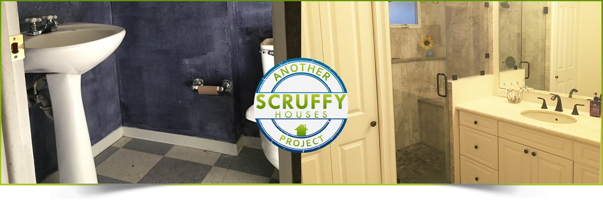 You know you’re in for a fun makeover when you have a matching set of brown toilet, sink, and tub. Pair that with a teal wall and a clay tile floor and you’re bound to have a great time. We discovered a window behind the tub (along with duct tape and sheetrock), the floor was tiled directly to the plywood, and the corners of the bathroom were curved and loaded with solid plaster. The demo took two full days because the tub was built directly into the wall and buried in cement and the plaster and chickenwire was thick everywhere. But the magic started happening shortly after that with a full marble floor to ceiling tile job, new window and fixtures, a marble basketweave floor and a soft blue accent on the walls. It turned out great!